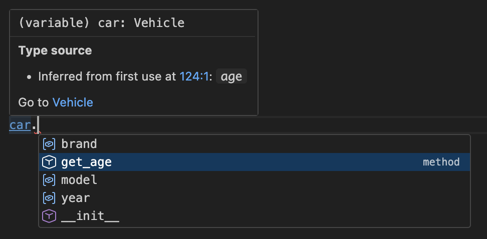 Strong feature set. The hover documentation is the best of the four; Pyrefly renders it cleanly and sometimes includes hyperlinks to class definitions.
